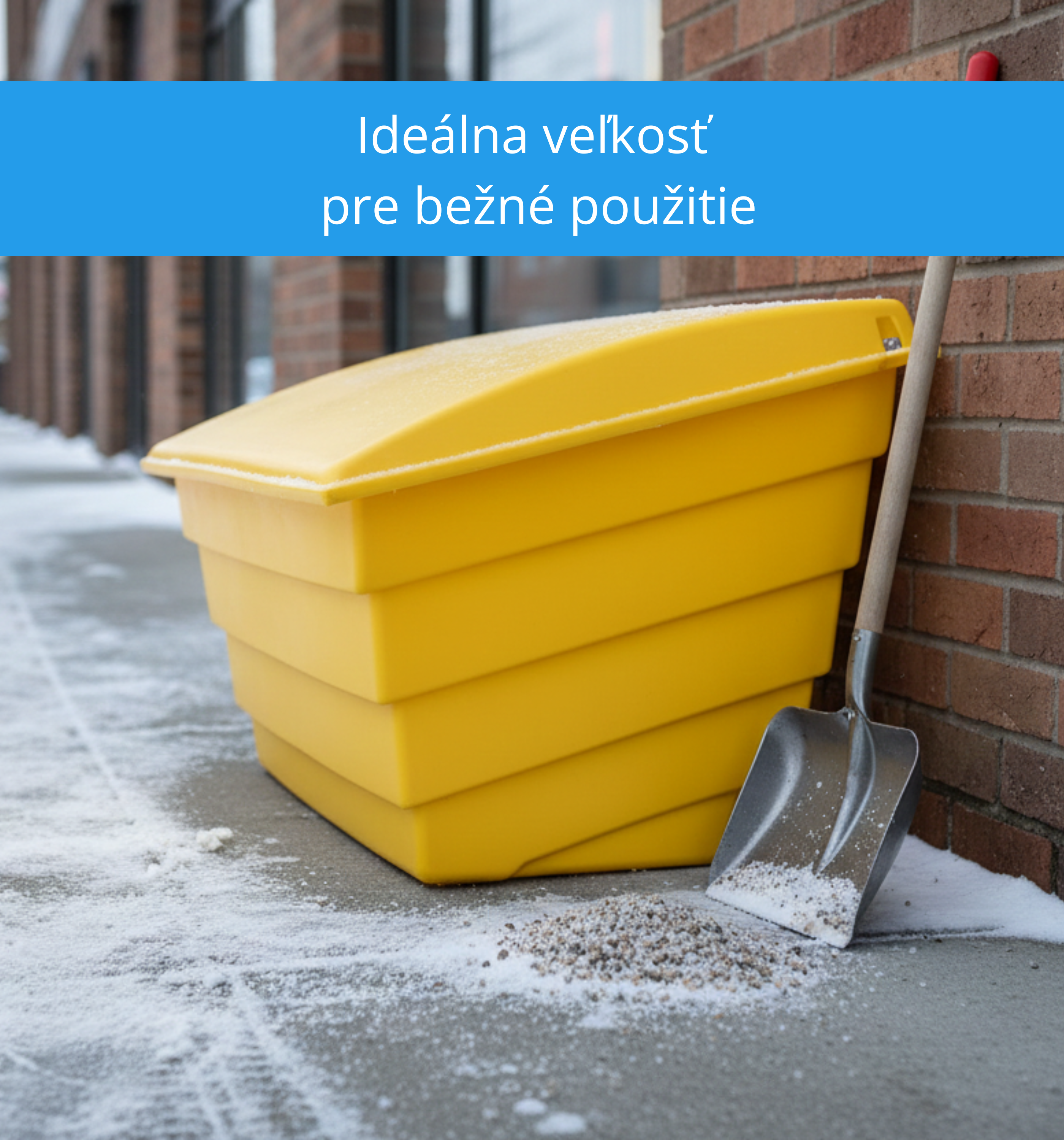 Posypový materiál tak zostáva suchý, sypký a okamžite pripravený na použitie. Veko zároveň zabraňuje nežiadanému vysypaniu materiálu a zvyšuje bezpečnosť a čistotu okolia, najmä na frekventovaných miestach.